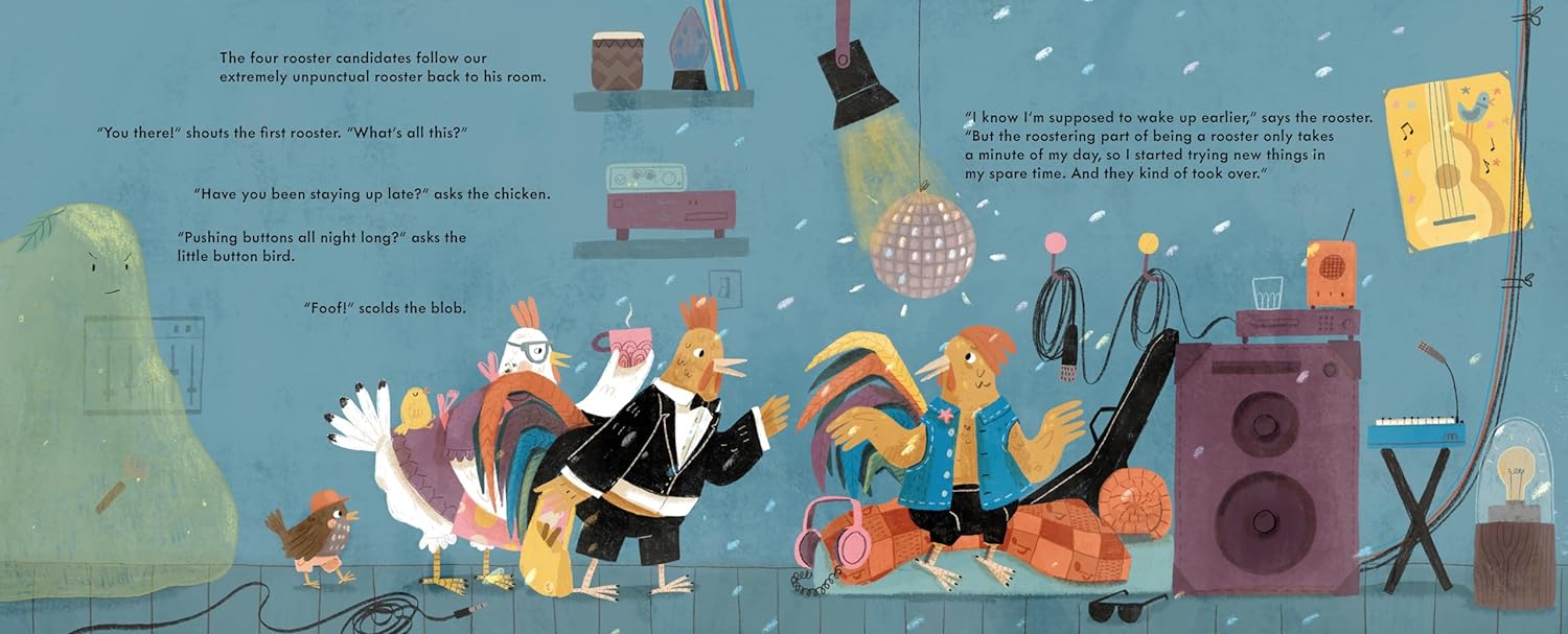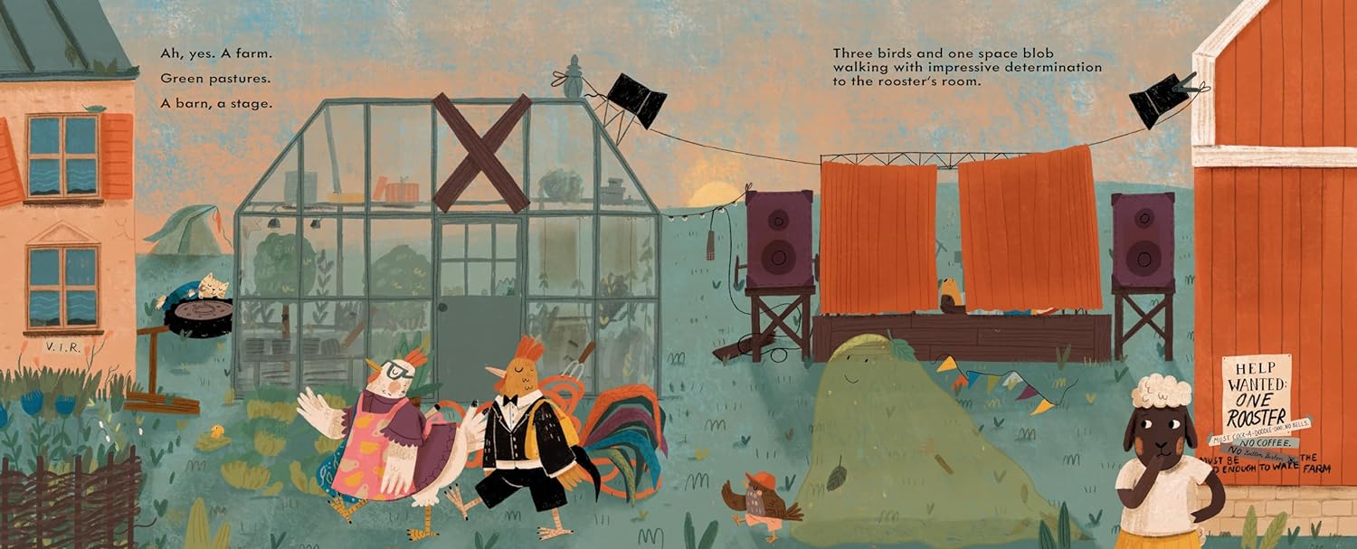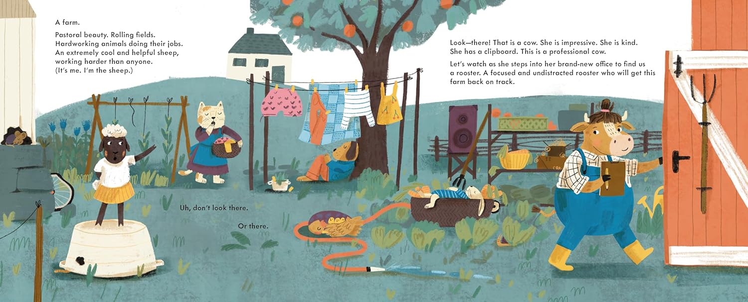 The Office meets Chicken Run in this workplace comedy, in which an “extremely cool and helpful sheep” reveals how a barnyard solves its productivity problem. When the farm’s rooster becomes distracted by a hobby and ignores his crowing responsibilities, the whole farm begins to oversleep. The farm’s cow (“She has a clipboard. This is a professional cow”) conducts interviews, dismissing each nontraditional candidate for replacement rooster. The first, dressed “in an inexplicable tuxedo,” wants to ring a bell instead of crowing; the second offers to wake everyone with “fresh, hot coffee”; the third, a small brown bird, wants to press a nonexistent button to do the job; and the fourth, a green, transparent blob, answers questions in its own blobby language (“Glarka-glarka-bloo”). It takes the warm cooperation of all four to get things moving, even if their distinctive gifts don’t shift the farm’s status quo. Alongside snappy narration from Falatko (Rick the Rock of Room 214), crisp-edged, graphical artwork by Stegmaier (AAALLIGATOR!) packs visual information into busy spreads in which a gardener rabbit dozes while the hose runs, and an audio speaker signals the rooster’s new interest. Ages 3–5.
