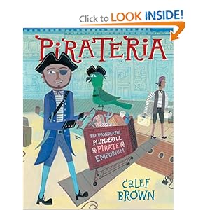 Yeah, Julie, could you get to this book, please? Ok: So Pirateria is a book about a store for pirates, who need to load up on pirate gear. Why has no one written a book about a pirate store before? I don’t know. I’m glad Calef Brown is the one that did it. This book rocks.